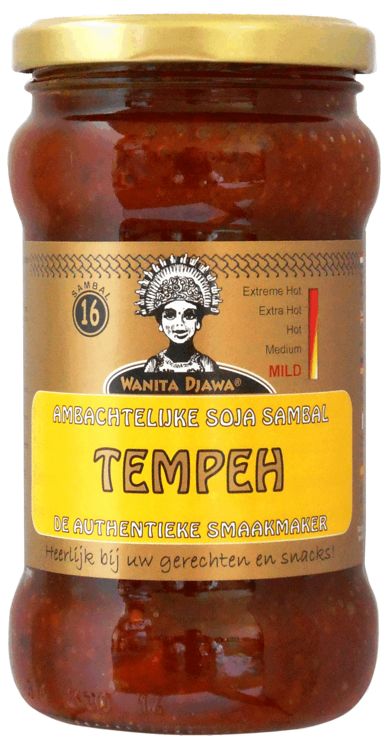 Wanitadjawa Sambal Tempeh combineert de pittigheid van sambal met de rijke, umami-smaak van tempeh. Deze veelzijdige saus is gemaakt van tempeh (soja), knoflook, uien en een melange van kruiden en specerijen, wat het perfect maakt voor gerechten zoals nasi, bami, of als dipsaus voor snacks. Geniet van de pittige, kruidige smaak met een plantaardige twist!